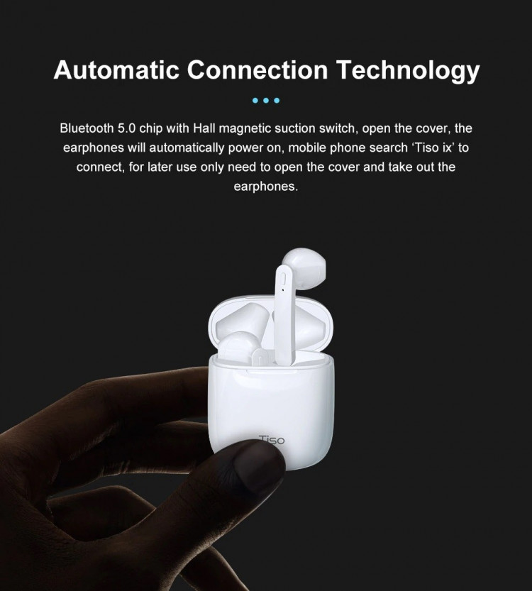 Đối với hộp sạc của Tai nghe TISO IX True Wireless tích hợp tính năng công tắc từ tính ở nắp hộp , chỉ với một thao tác đơn giản , chỉ cần mở nắp hộp tai nghe lên thì sản phẩm sẽ chuyển sang trạng thái sẵn sàng kế nối với các thiết bị của bạn , kết hợp với công nghệ bluetooth 5.0 thì càng khẳng định thêm về khả năng kết nối nhanh chóng cũng như tốc độ truyền tải ổn định , âm thanh một cách đầy đủ nhất