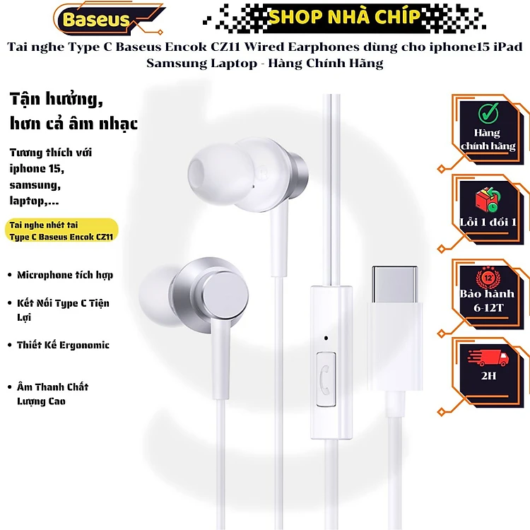 Tai nghe Type C Baseus Encok CZ11 Wired Earphones dùng cho iphone15 iPad Samsung Laptop - Hàng Chính Hãng