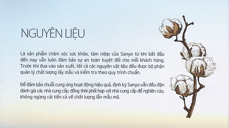 TẤT CẢ CÁC NGUYÊN LIỆU ĐỀU ĐƯỢC NHẬP KHẨU 100% TỪ NHẬT BẢN, ĐƯỢC KIỂM DUYỆT CHẤT LƯỢNG VÀ ĐỘ KHÁNG KHUẨN ĐỊNH KỲ ĐẺ ĐẢM BẢO CHẤT LƯỢNG TĂM BÔNG
