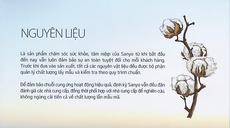 Sanyo Nhật Bản là một trong những công ty đi đầu trong lĩnh vực sản xuất tăm bông, được hình thành cách đây gần 50 năm tại Nhật. Từ những máy móc tự chế thô sơ ngày mới thành lập, công ty không ngừng sáng tạo và nâng cao công nghệ máy móc hiện đại, tân tiến. Nhờ đó chất lượng sản phẩm ngày càng được nâng cao và được sự tin dùng của đại đa số các đại lý lớn nhỏ và khách hàng tiêu dùng. Không dừng lại ở chất lượng sản phẩm, thiết kế bao bì của các dòng sản phẩm tại Nhật vô cùng phong phú, sáng tạo mà không kém phần sang trọng với tiêu chí vệ sinh, an toàn khi sử dụng.