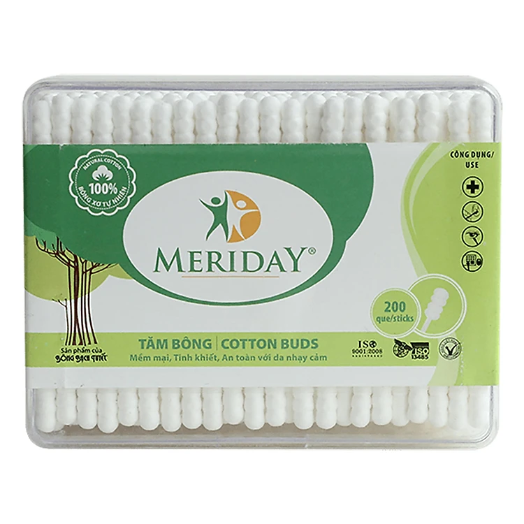 • Tăm Bông Meriday Bông Bạch Tuyết TP158 (200 Que) được làm từ 100% bông xơ tự nhiên, không pha sợi polyester, an toàn sạch sẽ không gây kích ứng kể cả khi sử dụng cho trẻ em.