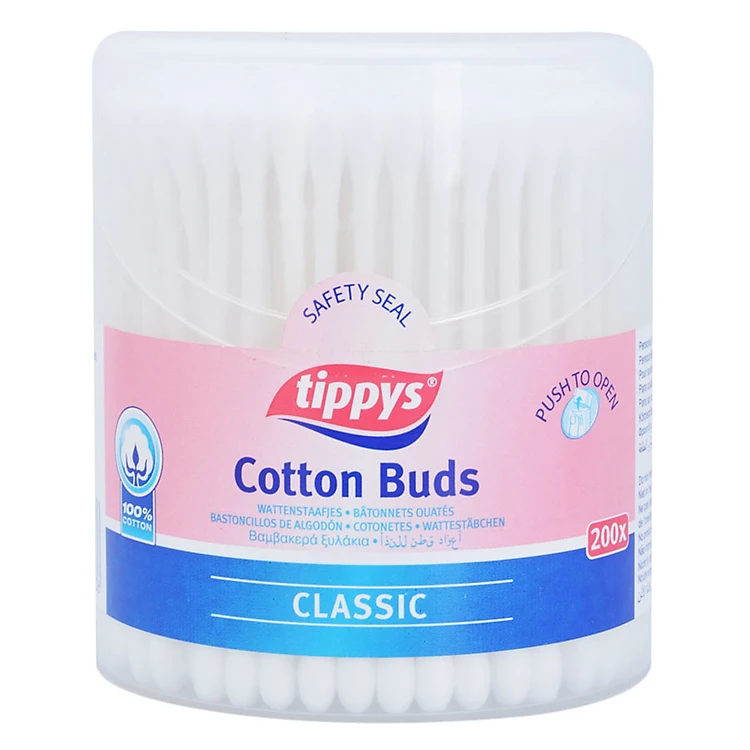 - Tăm Bông Tippys (200 Tăm / Hũ) được làm từ 100% cotton thiên nhiên đã tinh chế, rất mềm mại, mịn màng giúp thấm và làm sạch các chất bẩn bên trong tai, mũi một cách sạch sẽ nhẹ nhàng.