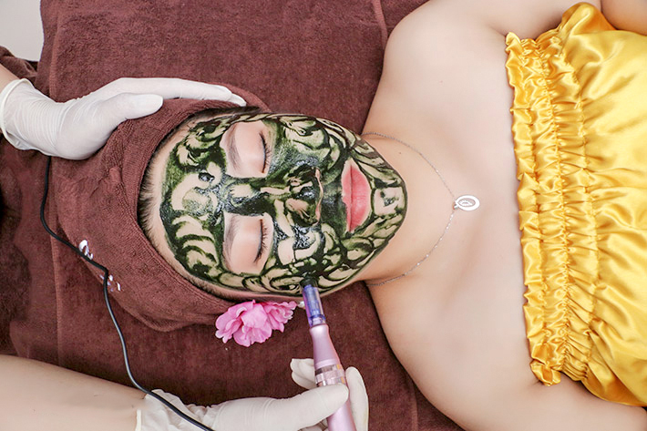Bước 8: Tiến hành cấy tảo xoắn bằng máy cấy tự động sử dụng đầu kim nano giúp trẻ hóa da, mờ thâm nám căng bóng da. (không gây tổn thương xâm lấn, không chảy máu).