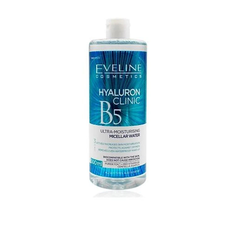 Nước tẩy trang Eveline Hyaluron Clinic B5 và tinh chất rau má làm dịu, dưỡng ẩm và phục hồi da 500ML