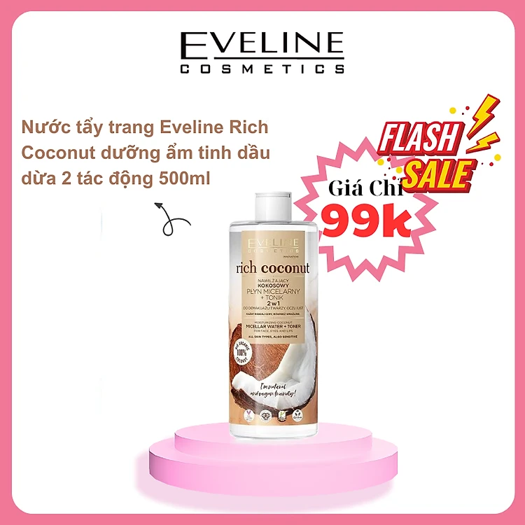 [Deal 99k] Nước tẩy trang Eveline Rich Coconut dưỡng ẩm tinh dầu dừa 2 tác động 500ML