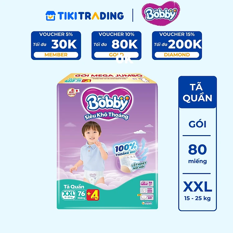 [TẶNG KÈM 4 MIẾNG] Tã quần Bobby Siêu Khô Thoáng - 100% Thoáng Khí Mega Jumbo - XXL76