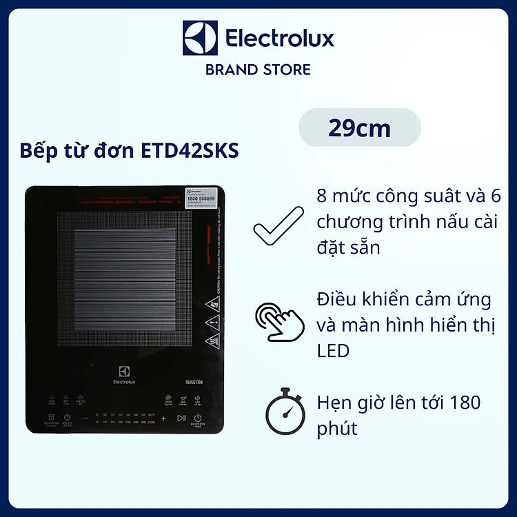 [Tặng Nồi, Chảo, Vỉ Hấp] Bếp từ đơn Electrolux ETD42SKS 8 mức công suất, 6 chương trình nấu cài đặt sẵn - Bảo hành 2 năm toàn quốc [Hàng chính hãng]