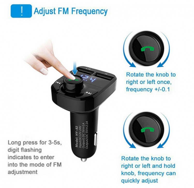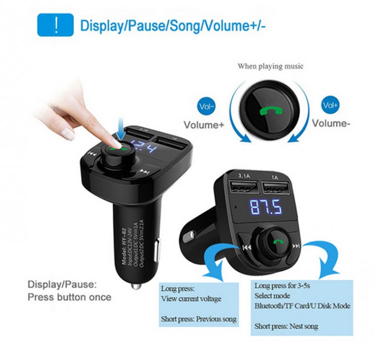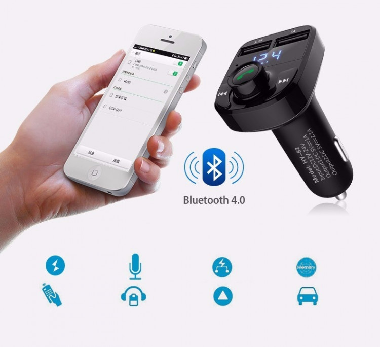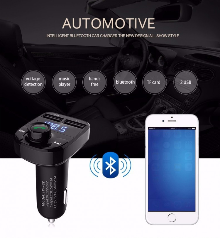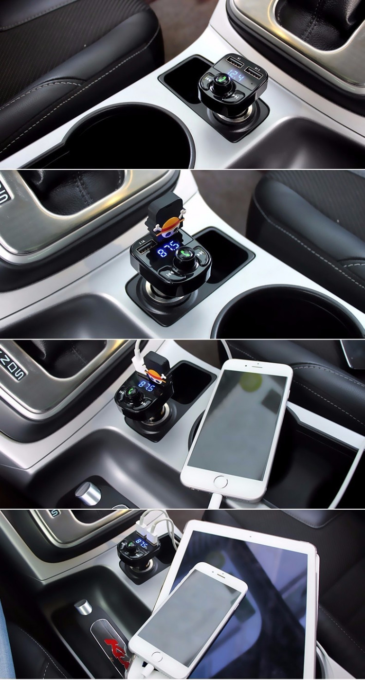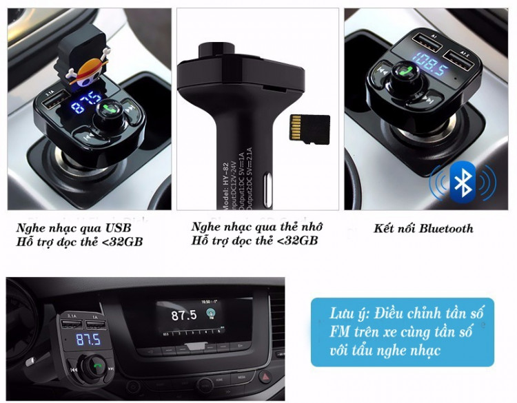Tích hợp bộ sạc thông minh với 2 cổng sạc giúp bạn có thể vừa nghe nhạc vừa sạc smartphone, iPhone, IPad... kết nối không dây với hệ thống loa trên xe hơi thông qua kết nối không dây qua sóng FM tần số từ87.5 -108Hz