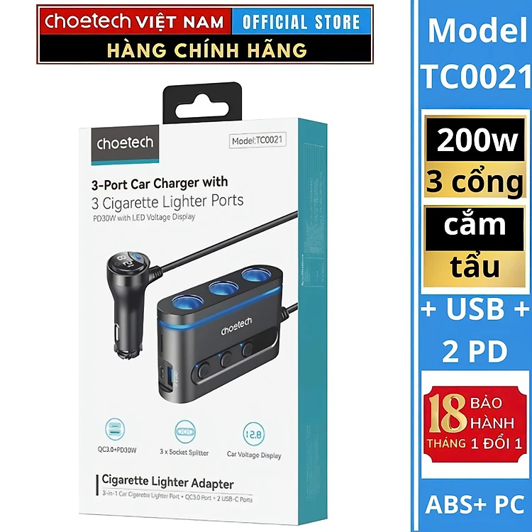 Tẩu sạc đa năng mở rộng Choetech TC0021 thành 3 cổng cắm tẩu và 1 Usb + 2 Usb C công suất 200W (Hàng chính hãng)