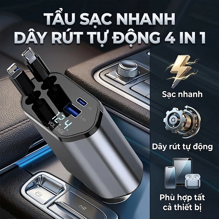Tẩu Sạc Nhanh C1 Dây Rút Tự Động 4 in 1 USB Type-C Và Lightning Đa Năng Vỏ Hợp Kim Cao Cấp - Nhập Khẩu Chính Hãng