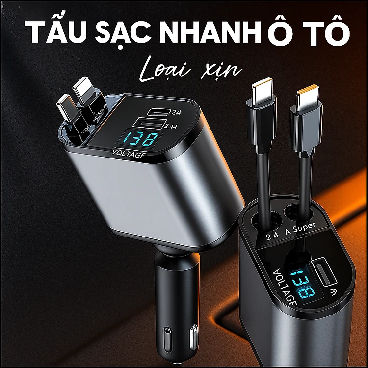 Tẩu Sạjc Ô Tô Siêu Bền 120W – 4-in-1 Sạc Cực Nhanh, Màn Hình Hiển Thị Vôn, đèn trang trí
