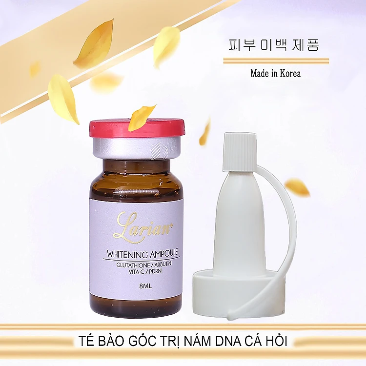 Với thành phần chính là DNA Cá Hồi và Abutin,( hợp chất làm trắng da) và các thành phần bổ trợ được chiết xuất từ thực vật,cùng Glutathione, Axit hyaluronic tế bào dưỡng trắng da GIẢM thâm, nám Whitening ampoule giúp tạo cảm giác dễ chịu mịn màng cho làn da,và hiệu quả được kéo dài liên tục. Sản phẩm sau khi được đưa vào da, có tác dụng gây ức chế thành phần melanin tại các bộ phận dễ hình thành sắc tố, giúp làm trắng da,cung cấp dưỡng chất của thành phần Axit hyaluronic và các loại cây, các thành phần peptide tạo sự đàn hồi và săn chắc cho da