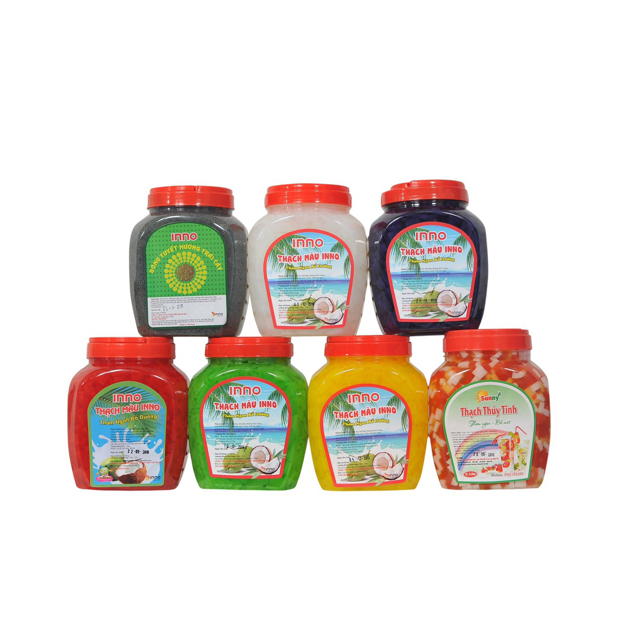 Thành phần: Nước sạch, bột làm thạch, thạch dừa khô,Acid citric, Aspartam, Asesufam Kali, Natri Cyclamate, Kali sorbat, Natri benzeoate, Natri carbonxymethyl cellulose, sunset yellow, hương xoài.