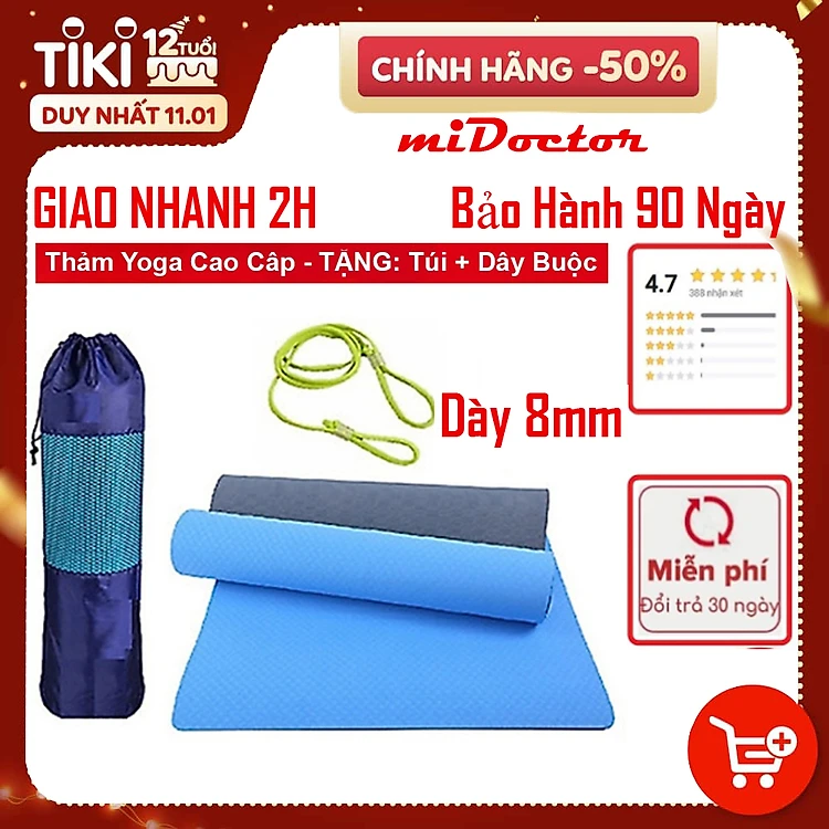 Thảm Tập YoGa Dày 8mm miDoctor CHỌN MÀU + Bao Thảm Tập Yoga + Dây Thảm Tập Yoga (Túi, Dây Giao Màu Ngẫu Nhiên)