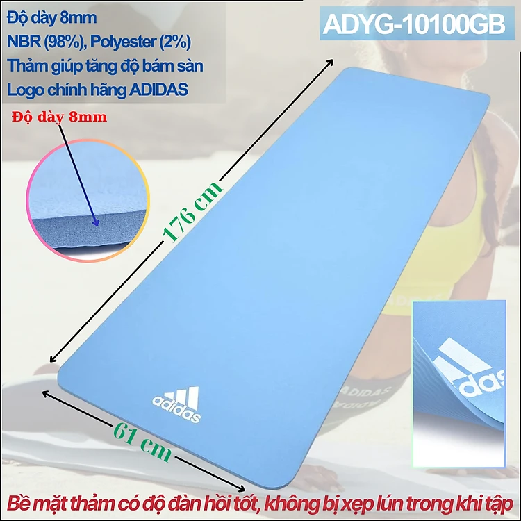 Thảm Tập Yoga, Fitness Chính Hãng ADIDAS ADYG-10100 - Thảm Tập Tăng Độ Bám Tay, Dày 8mm Độ Êm Cao