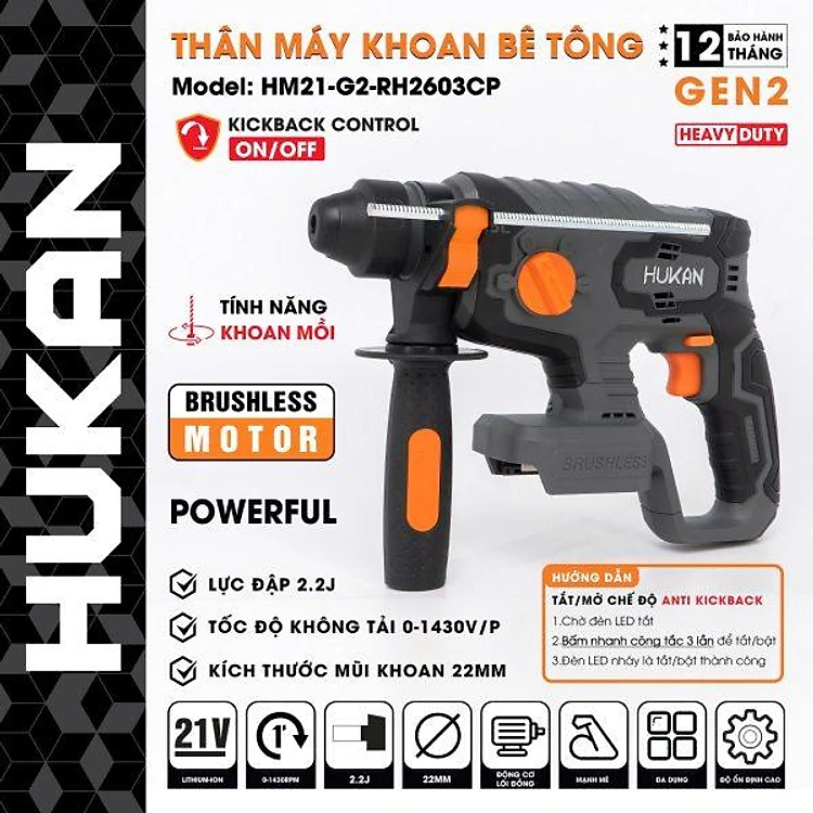THÂN MÁY KHOAN BÊ TÔNG PIN 21V 22MM BODY HM21-G2-RH2603CP HUKAN -HÀNG CHÍNH HÃNG