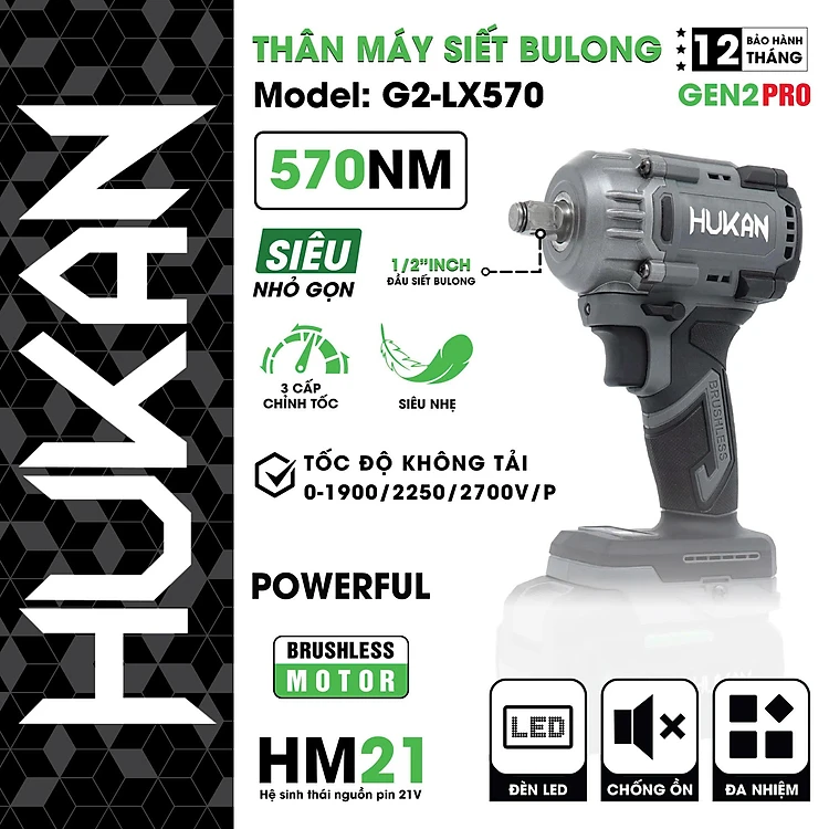 THÂN MÁY SIẾT BULONG PIN 21V BODY G2-LX570 HUKAN -HÀNG CHÍNH HÃNG