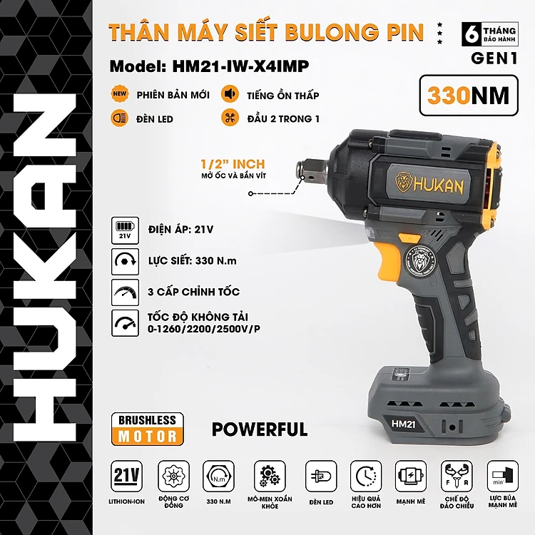 THÂN MÁY SIẾT BULONG PIN 21V BODY HM21-IW-X4IMP HUKAN -HÀNG CHÍNH HÃNG