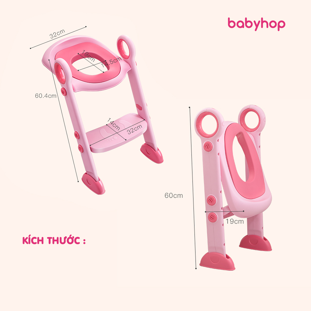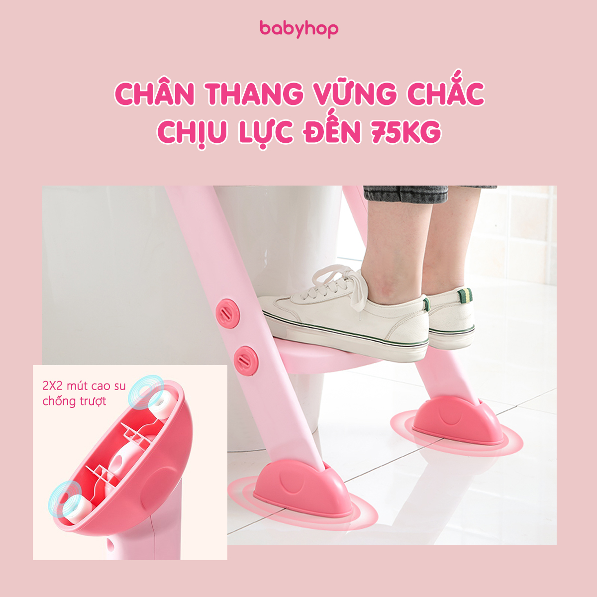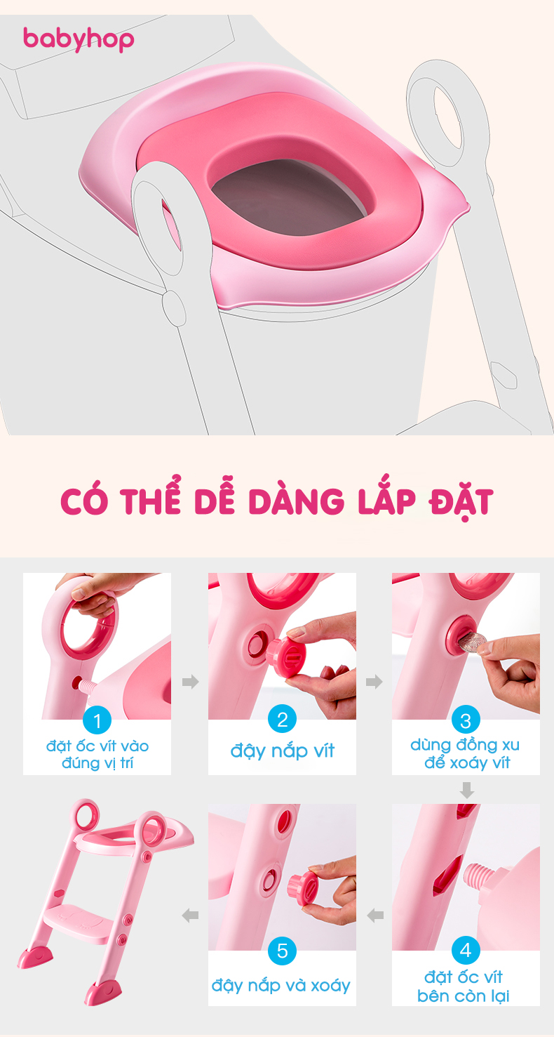 Sản phẩm làm từ chất liệu nhựa PP cao cấp, an toàn và rất bền, viền nắp bồn bằng đệm xốp mềm êm ái Đến khi bé đi vững là có thể để bé tự sử dụng. Chỉ lần đầu được người thân hướng dẫn bé sẽ rất thích thú và tự mình thực hiện vào những lần tiếp theo, rất tốt để luyện tính tự lập cho bé yêu Khả năng tự điều chỉnh góc thích hợp với các bồn vệ sinh có chênh lệch độ cao mà chân thang vẫn tiếp nền vững vàng. Kích thước bề mặt hoàn toàn hợp lý để bé ngồi một cách thoải mái Bậc thang chống trượt cùng với tay vịn giúp bé luôn ngồi vững trong suốt quá trình đi vệ sinh. Bệ phù hợp với hầu hết các bồn cầu hiện đại ngày nay.