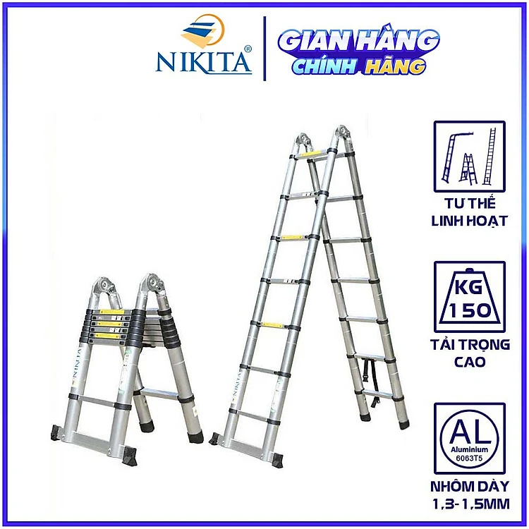 Thang nhôm rút đôi, có bánh xe di chuyển tiện lợi, thanh giằn khóa và thân thang an toàn, chiều cao từ 3,8m - 8m