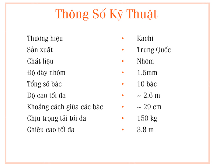 Sản phẩm được làm từ chất liệu hợp kim nhôm cao cấp chịu lực đến 150kg. Thang nhôm rút gọn Kachi được sản xuất theo công nghệ Nhật Bản, đạt tiêu chuẩn khắt khe về chất lượng trước khi đưa ra thị trường.
