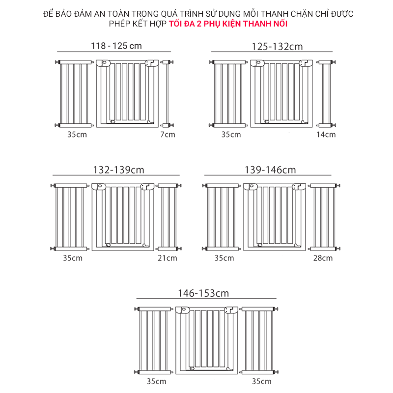 • Kích thước mở rộng: Kích thước tối đa của Thanh chắn Babysafe + Kích thước thanh nối