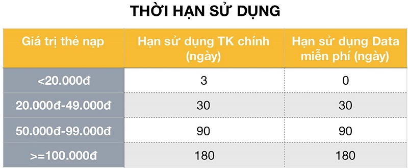 - Mỗi tháng cần tiêu dùng trong tài khoản tối thiểu 20.000đ. Nếu không dùng đủ Vietnamobile sẽ tự động trừ tiền trong tài khoản chính đủ 20.000đ. Nếu không trừ được sim bạn sẽ bị chặn, cần nạp tối thiếu 20.000đ để mở.