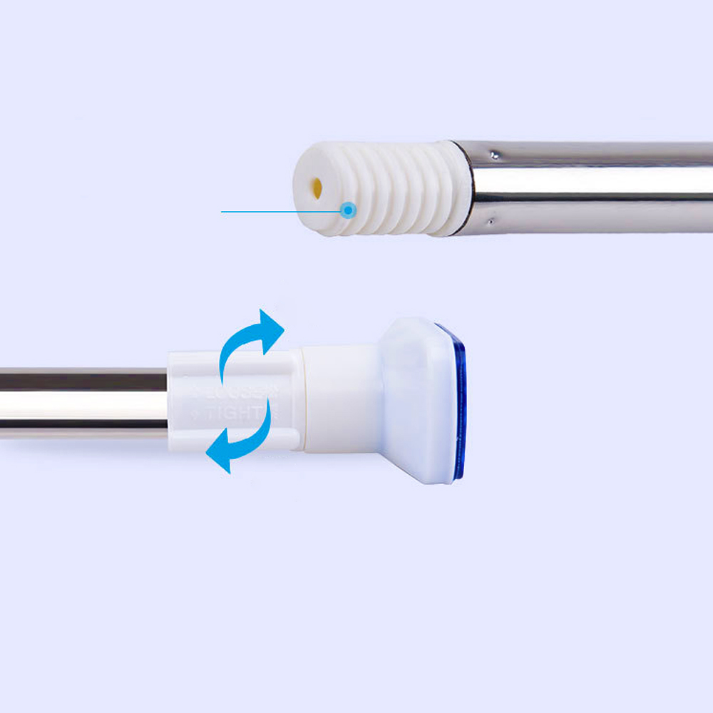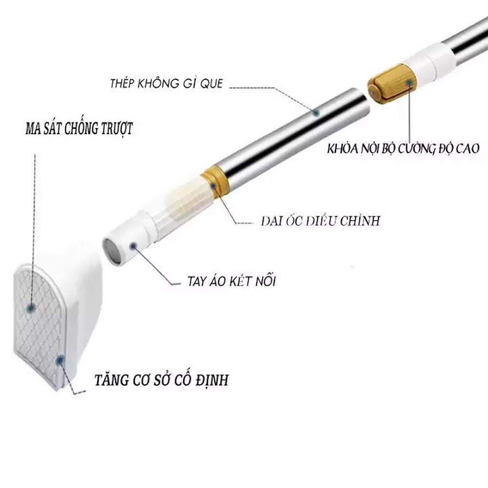 Bước 3: Một tay giữ cố định ống nhỏ, tay còn lại vặn đầu ống (phần nhựa trắng) ngược chiều kim đồng hồđể đầu ống dài ra thêm ép hai đầu thanh vào tường, vặn càng chặt thì bám càng chắc.