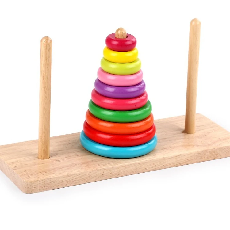 Tòa tháp Hà Nội 10 vòng bao gồm ba thanh và mười đĩa gỗ có kích thước và màu sắc khác nhau. Ban đầu chúng được xếp chồng lên nhau theo kích thước tăng dần trên một trong ba chốt. Mục tiêu của tháp Hà Nội là chuyển toàn bộ tòa tháp sang một trong những chốt khác. Chúng ta chỉ có thể di chuyển một đĩa tại một thời điểm và không bao giờ một đĩa lớn hơn được nằm trên một đĩa nhỏ hơn.- Tòa tháp Hà Nội này bao gồm ba thanh và mười đĩa tròn có kích cỡ khác nhau và một đế trụ bên dưới