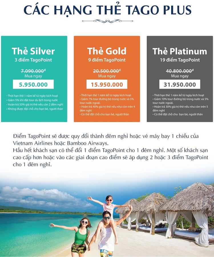 Chưa kể đến việc sở hữu kỳ nghỉ Tago Plus bạn có thể lựa chọn linh hoạt 3 loại thẻ là: thẻ Bạc, thẻ Vàng và thẻ Platinum, mỗi thẻ tương đương với các mức giá khác nhau, tùy vào số điểm trong thẻ và kế hoạch chuyến đi của bạn.
