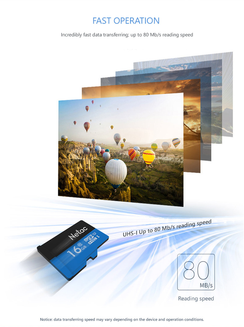 • Thẻ nhớ Netac có tốc độ truyền tối đa lên đến 80MB/s giúp bạn tiết kiệm tối đa thời gian truyền dữ liệu. Bạn có thể chụp Full HD hoặc quay video chất lượng cao.