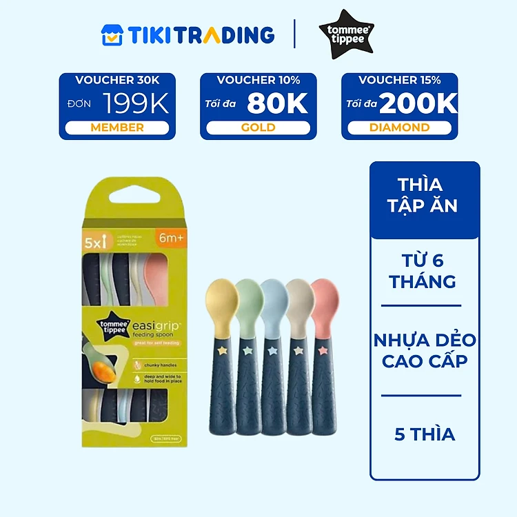 Thìa Tập Ăn Bề Cho Bé Tommee Tippee Easigrip Từ 6 Tháng (Bộ 5 Thìa)