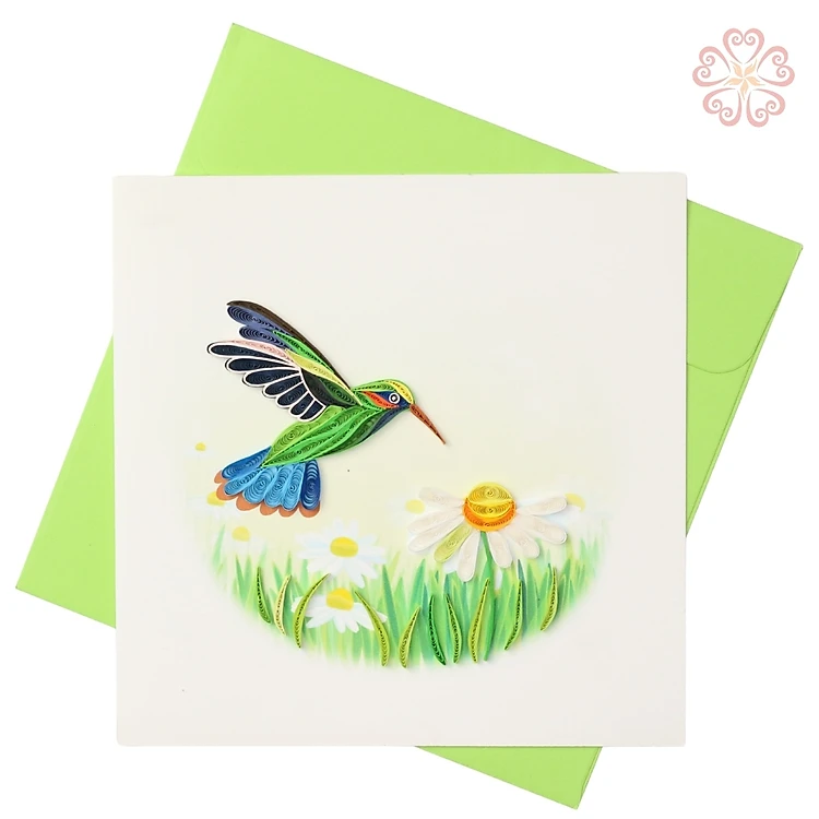 Thiệp Giấy Xoắn Nghệ Thuật - chú chim cùng cánh đồng hoa cúc - size 15x15cm
