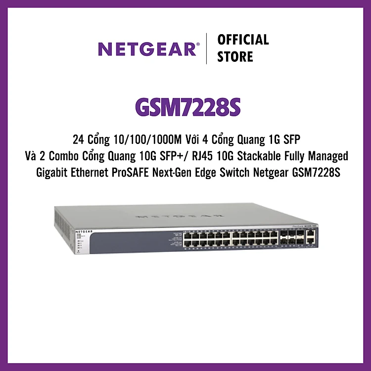 Thiết Bị Chia Mạng Gắn Rack 24 Cổng 10/100/1000M Với 4 Cổng Quang 1G SFP Và 2 Combo Cổng Quang 10G SFP+/ RJ45 10G Stackable Fully Managed Gigabit Ethernet ProSAFE Next-Gen Edge Switch Netgear GSM7228S - Hàng Chính Hãng