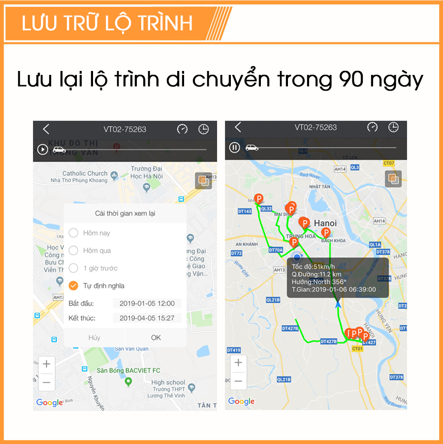 * Lưu trữ lộ trình di chuyển của xe trong 90 ngày. Bạn có thể xem được mọi thông tin chi tiết về trạng thái, thời gian dừng đỗ, cung đường xe đã đi, vận tốc di chuyển của xe như thế nào