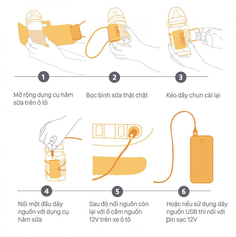 Bộ sản phẩm bao gồm : dụng cụ hút sữa, phích cắm DC 12 V và phích cắm với đầu USB thích hợp với pin sạc 12V
