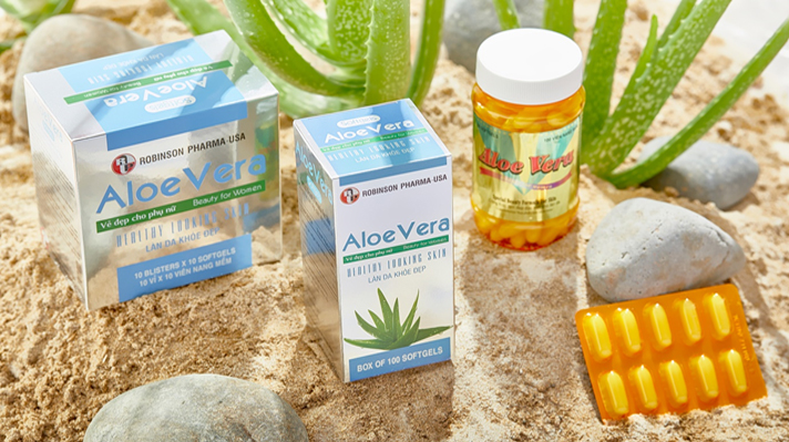 • Aloe Vera – Robinson Pharma Usa với công thức đặc biệt gồm: Aloe + Sữa ong chúa + Vitamin E. Aloe chứa rất nhiều chất chống oxy hóa bao gồm: tiền sinh tố A (beta carotene), Vitamin C và được bổ sung Vitamin E cùng sự kết hợp với Sữa Ong chúa có thể giúp cải thiện độ săn chắc tự nhiên của da và giữ cho da ngậm nước, giúp làm mờ các nếp nhăn một cách tự nhiên. Chất chống oxy hóa giúp chống lại thiệt hại gây ra bởi các gốc tự do gây ra trên da, giúp da luôn căng mịn, tràn sức sống.