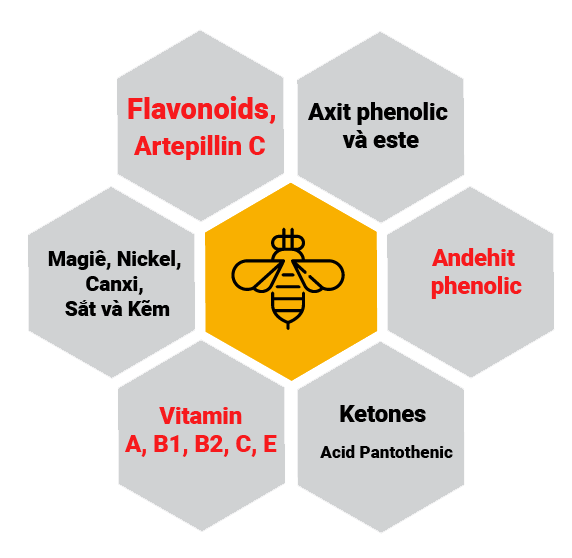 - Với thành phần phức tạp gồm hơn 300 loại hợp chất có trong keo ong, chủ yếu là polyphenol có đặc tính kháng khuẩn, nấm, virus và chống oxy hóa mạnh mẽ, được bổ sung thêm các vitamin và nguyên tố vi lượng quan trọng cho sự sinh trưởng và phát triển của các tế bào.