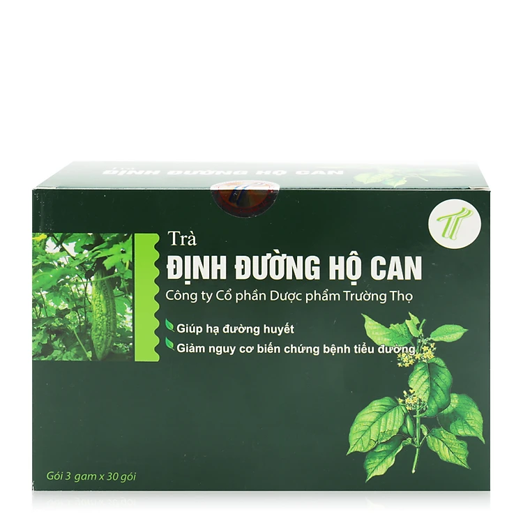 Trà định đường hộ can chứa dây thìa canh, mướp đắng, nhân trần, cam thảo giúp hạ và ổn định đường huyết, ngăn ngừa và hạn chế những biến chứng do tiểu đường gây ra. Sản phẩm dùng cho người bị tiểu đường.