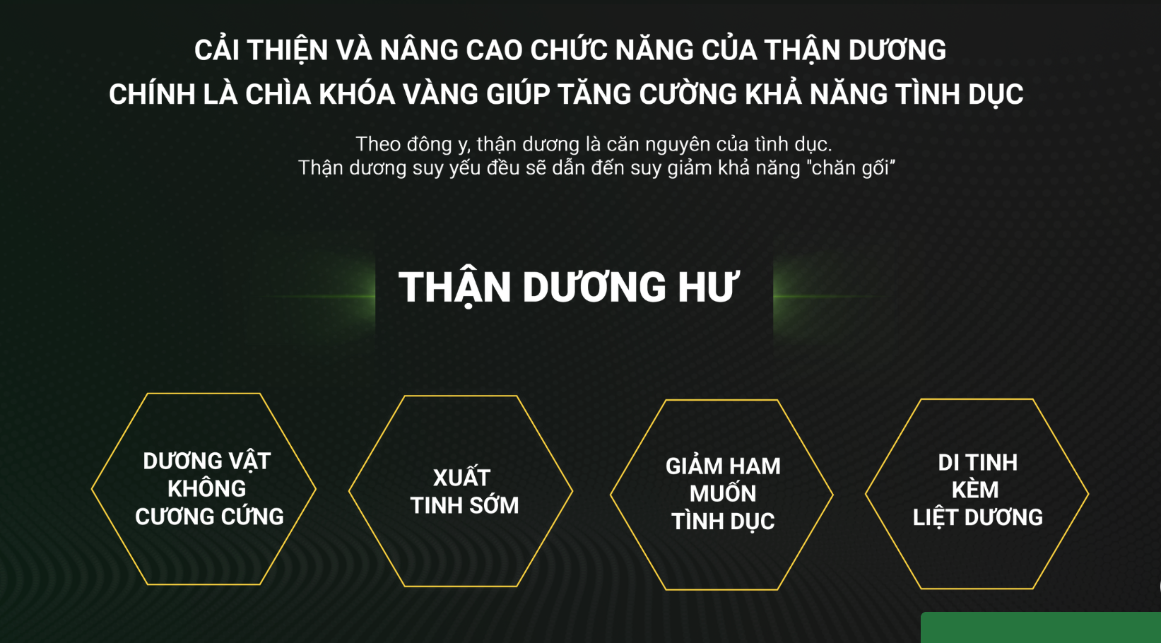 Theo quan điểm của y học cổ truyền, Thận là tinh hoa của ngũ tạng (Tâm, Can, Tỳ, Phế, Thận), là gốc của sự sinh trưởng và sinh sản. Khi Thận yếu chức năng của Thận suy giảm mà biểu hiện rõ nhất ra bên ngoài là suy giảm chức năng sinh lý, giảm ham muốn tình dục, xuất tinh sớm… Để cải thiện tình trạng đó cần phải bồi bổ liên tục cho Thận.