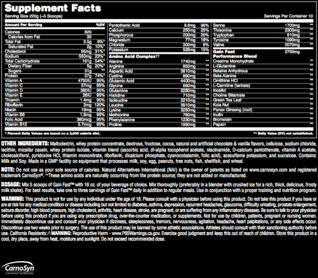 Gain Fast 3100 cung cấp 3100 calories chất lượng mỗi ngày từ 150g protein, 596g Carbs, và chỉ có 15g chất béo. Gain Fast còn được bổ sung các enzymes tiêu hoá và Inulin, giúp bạn tránh được hiện tượng đầy bụng, khó tiêu giống như khi bạn dùng 1 số SP tăng cân khác. Inulin là một chất xơ đặc biệt trợ giúp tiêu hóa các chất protein, carbs, chất béo cần thiết cho cơ thể phát triển. Ngoài ra, sản phẩm còn có chứa các anabolic tăng cường, sterols thực vật tự nhiên (beta- sitosterol, stigmasterol, fucosterol, camprsterol, …), EFAs, và các chất phát triển cơ bắp.