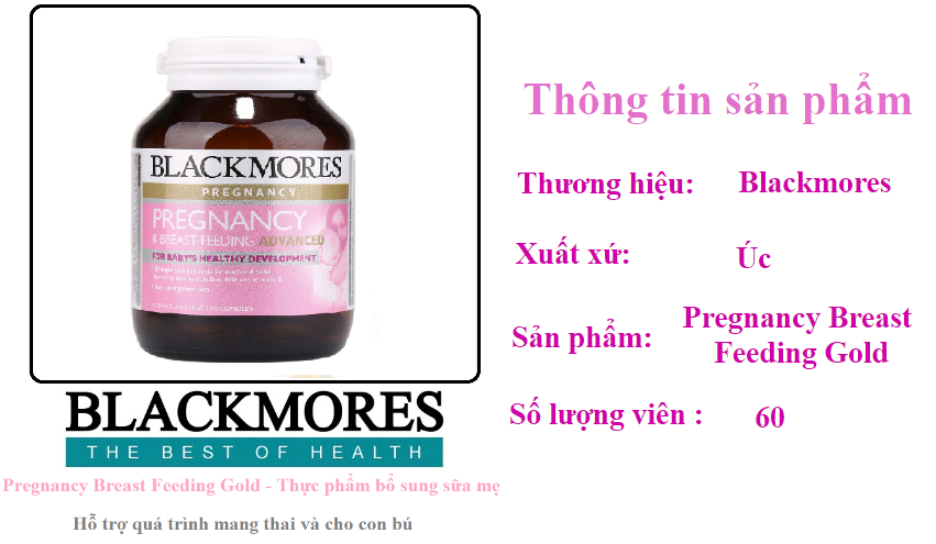 Blackmores Pregnancy and Breast-Feeding Gold đã được phát triển dựa trên nhu cầu dinh dưỡng của phụ nữ mang thai và cho con bú tại Úc để giúp hỗ trợ bổ sung dinh dưỡng dưới dạng một viên nang nhỏ dễ nuốt hơn. Sản phẩm chứa 20 chất dinh dưỡng quan trọng bao gồm 12 vitamin, 7 khoáng chất và acid béo omega-3 không mùi. Ngoài ra sản phẩm còn cung cấp lượng iod và acid folic hàng ngày dựa trên hướng dẫn bổ sung cho phụ nữ mang thai ở Úc.