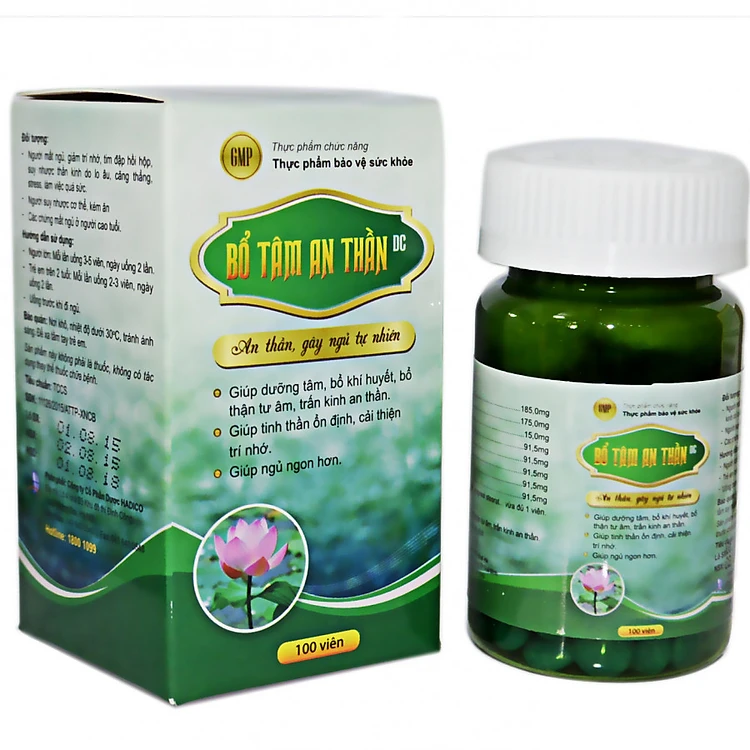 THÀNH PHẦN : Hoài sơn : 185,0 mg; Liên nhục: 175,0 mg; Liên tâm: 15 mg; Lá dâu: 91,5 mg; Lá vông: 91,5 mg; Bá tử nhân: 91,5 mg; Toan táo nhân: 91,5 mg; Long nhãn: 91,5 mg. Phụ gia tinh bột sắn, lactose, talc, magnesi stearat...vừa đủ 1 viên
