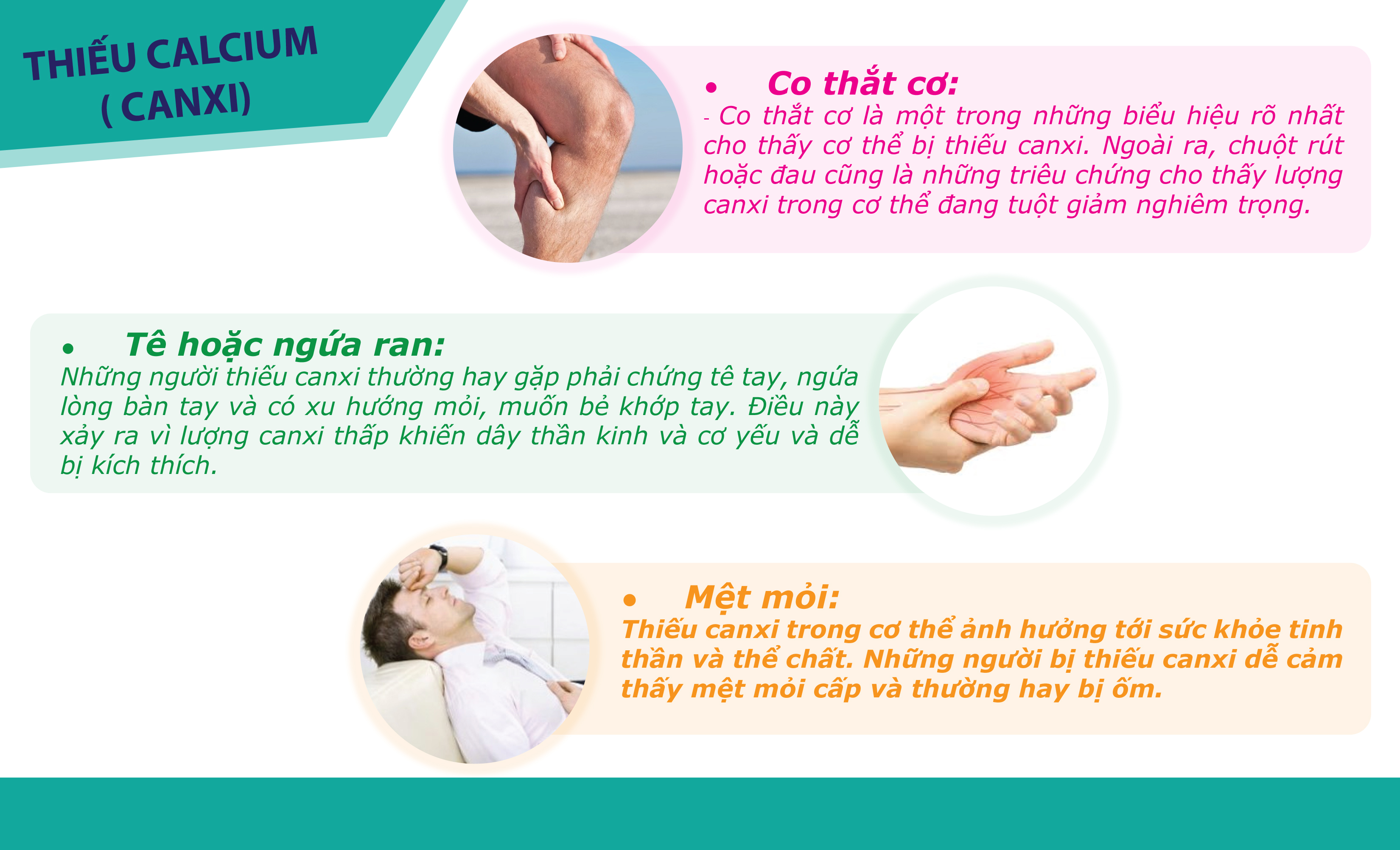 Khi cơ thể thiếu calcium (canxi) sẽ xuất hiện những dấu hiệu khó chịu cũng như hậu quả bệnh tật không thể khắc phục hoàn toàn được, làm cho sức khỏe giảm sút, ảnh hưởng chất lượng cuộc sống.