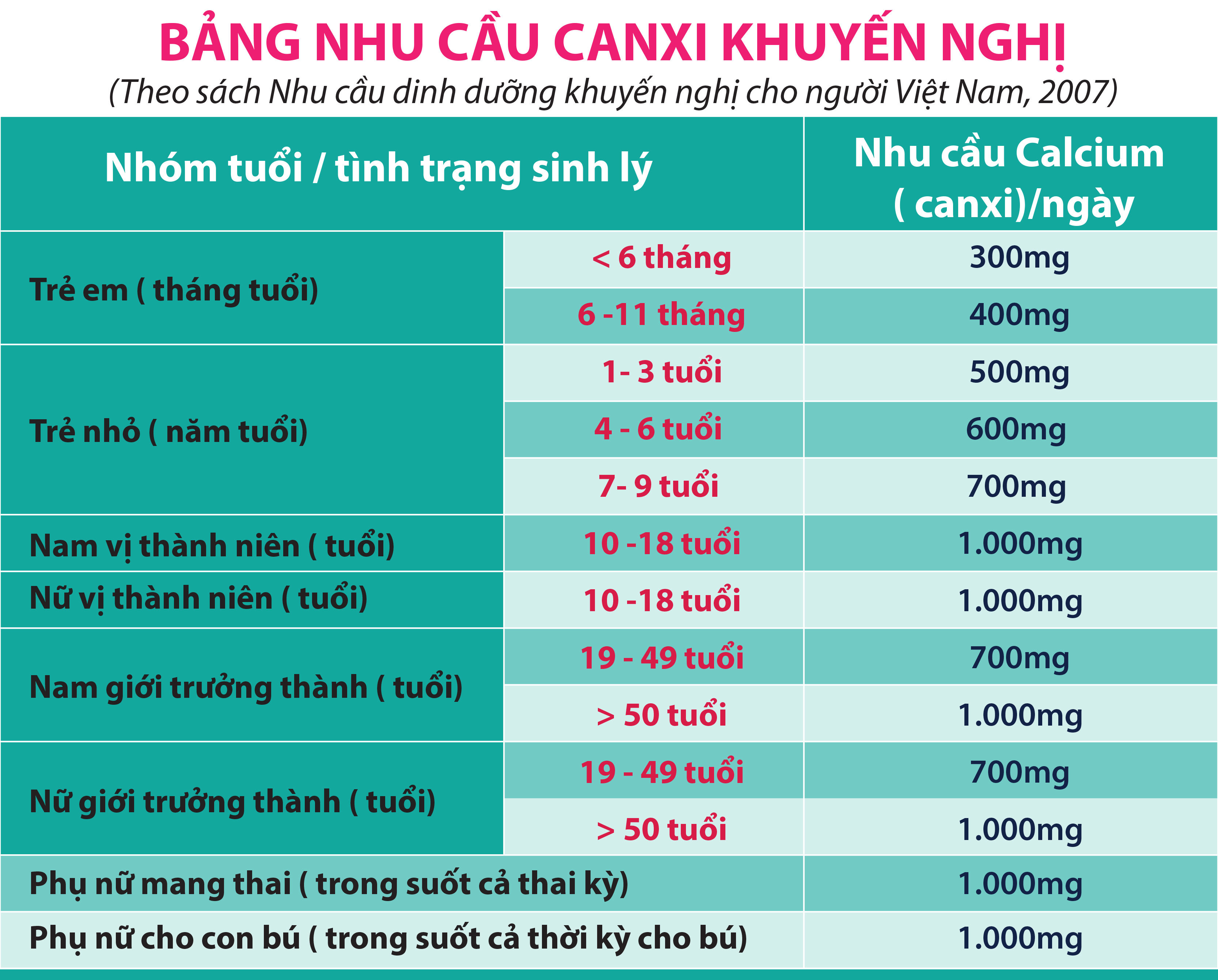 · Đối tượng 0 – 50 tuổi cần 5 mcg/ngày tương ứng 200 UI/24 giờ