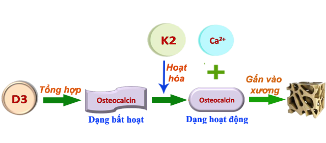 - Bộ 3 vitamin Canxi, K2, D3 là không thể thiếu khi đi kèm nhau. Vitamin D3 là chất dẫn truyền giúp hấp thụ canxi vào xương. Nhờ có K2 mà chất osteocalcin (dạng bất hoạt) --> osteocalcin( dạng hoạt động) + canxi --> để gắn vào xương. của con và mẹ.