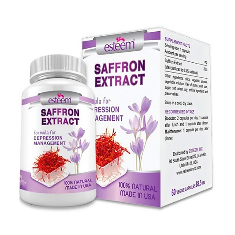 Thực Phẩm Chức Năng Hỗ Trợ Giúp Xua Tan Chứng Trầm Cảm Chiết Xuất Nghệ Tây Esteem Saffron Extract ( Hộp 60 Viên ) là sản phẩm viên uống thảo dược chứa 100% chiết xuất nghệ tây tự nhiên hỗ trợ kiểm soát bệnh trầm cảm, hỗ trợ người bệnh mau chóng lấy lại tinh thần và niềm vui trong cuộc sống.