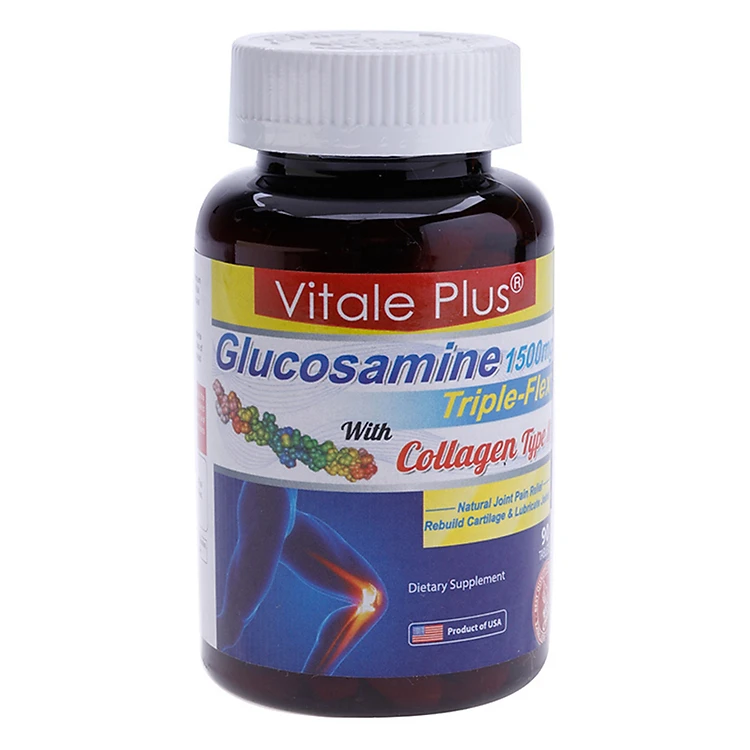 - Thực phẩm chức năng hỗ trợ xương khớp Glucosamine với thành phần chủ yếu là Glucosamine và được bổ sung thêm Collagen type II để mang đến hiệu quả tốt nhất cho người dử dụng, giúp giảm đau khớp, tái tạo sụn và tăng tiết dịch khớp, cung cấp collagen trong sụn khớp, ngăn ngừa thoái hóa khớp, duy trì vận động nhẹ nhàng.
