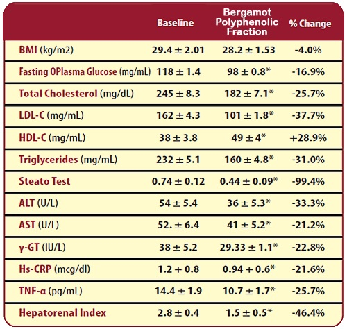 Nghiên cứu ngẫu nhiên có đối chứng giả dược này đã kiểm tra ảnh hưởng của chiết xuất bergamot polyphenolic (BPF) ở những người có hội chứng chuyển hóa và bệnh gan nhiễm mỡ không do rượu (NAFLD). Tổng cộng có 107 người dùng giả dược hoặc BPF (650 mg) hai lần mỗi ngày trong 120 ngày. Chỉ nhóm BPF mới giảm đáng kể lượng đường trong máu lúc đói, cholesterol LDL (“xấu”), chất béo trung tính, tăng cholesterol HDL (“tốt”) và cải thiện tình trạng gan nhiễm mỡ (tăng cường chức năng gan, giảm tình trạng viêm gan (giảm TNF-α và CRP)