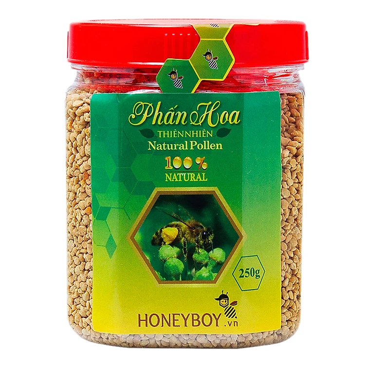 Thực Phẩm Chức Năng Phấn Hoa Thiên Nhiên HONEYBOY Hũ 250g là sản phẩm tự nhiên do con ong thu gom trong quá trình đi hút mật. Nó là nguồn thức ăn chính cung cấp protein, chất béo, vitamin, nguyên tố vi lượng và các chất dinh dưỡng khác cho đàn ong.